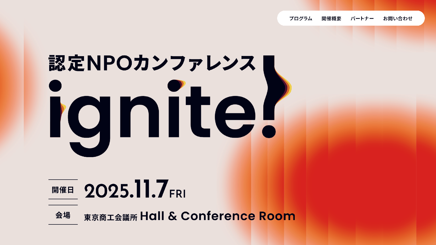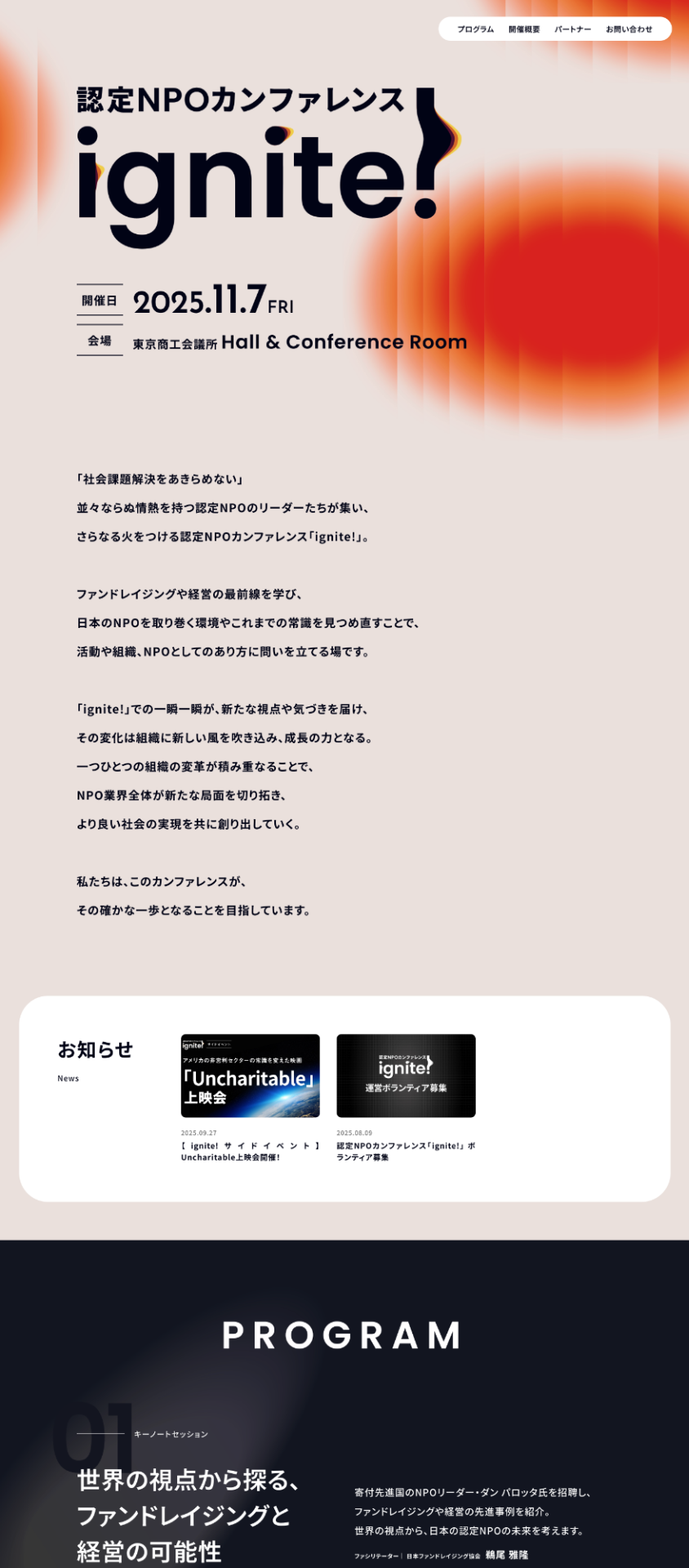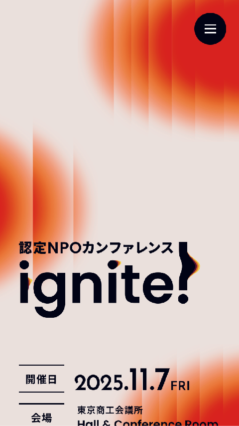 認定NPOカンファレンス ignite!は、日本の認定NPOの未来を考える招待制カンファレンスです。国内外の実践者や専門家が集い、NPO経営とファンドレイジングの先進事例を紹介します。