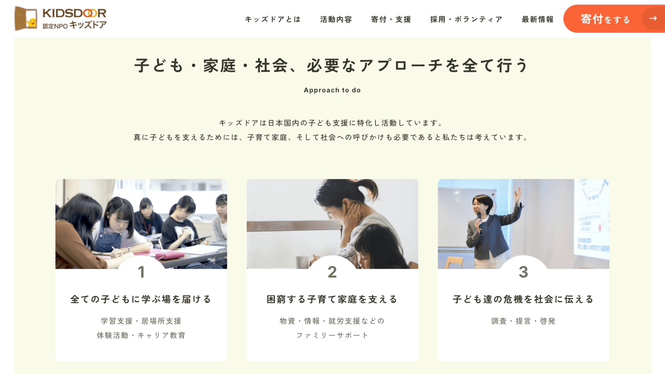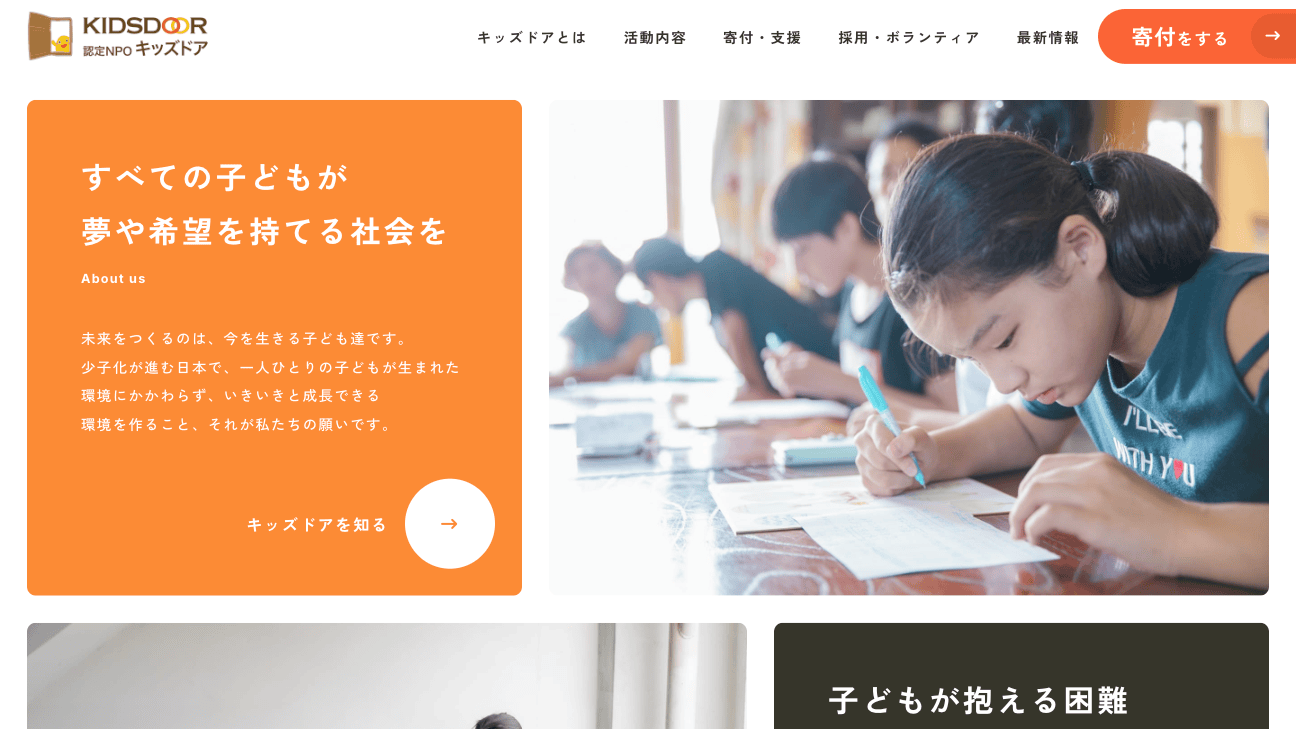 キッズドア様は、日本国内の子ども支援に特化し、すべての子どもが夢や希望を持てる社会の実現に向けて活動している認定NPO法人です。
