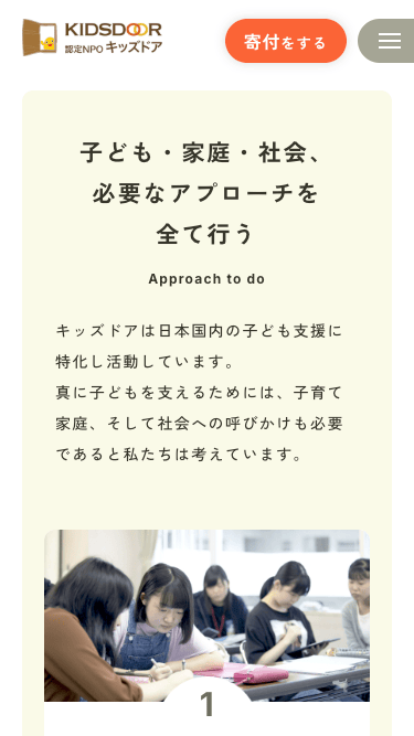 具体的には、子どもや保護者、ボランティア、寄付者など、それぞれの立場からの声をサイト内の各所に配置することで、キッズドア様の魅力と活動の意義を可視化しました。